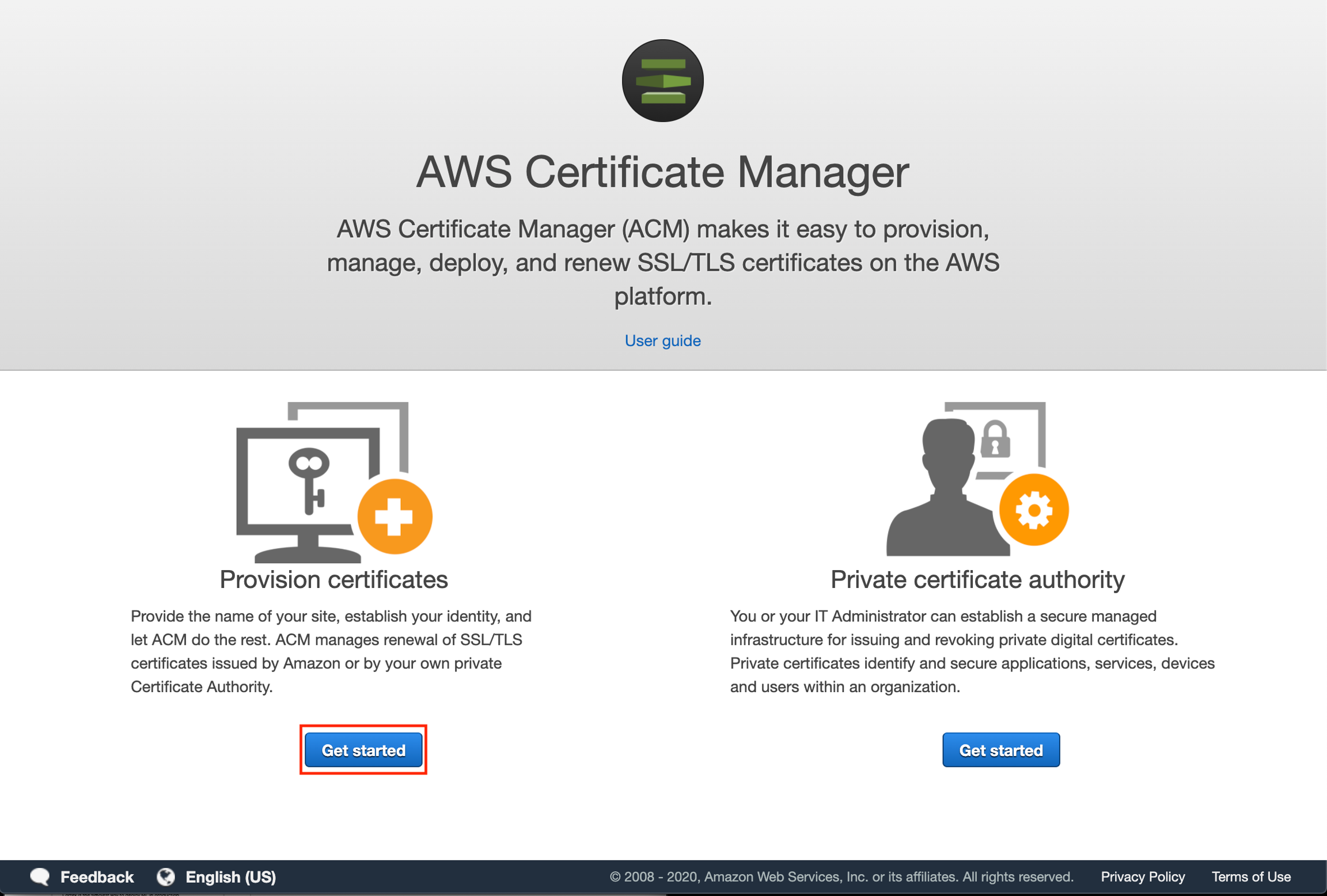 To create an SSL certificate, go to the ACM console and click "Get Started" under the "Provision certificates" section.