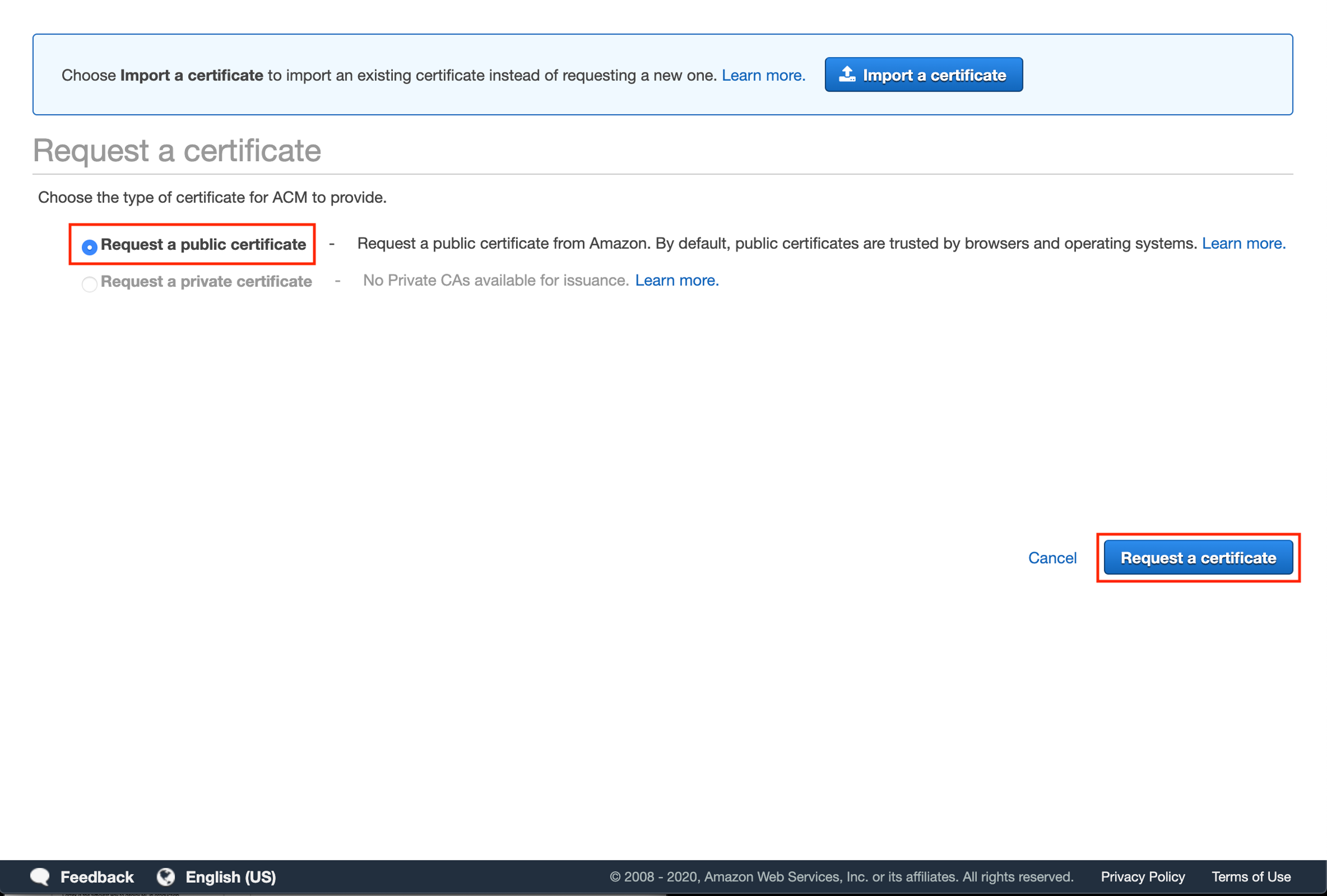 Select "Request a public certificate" and then "Request a certificate".