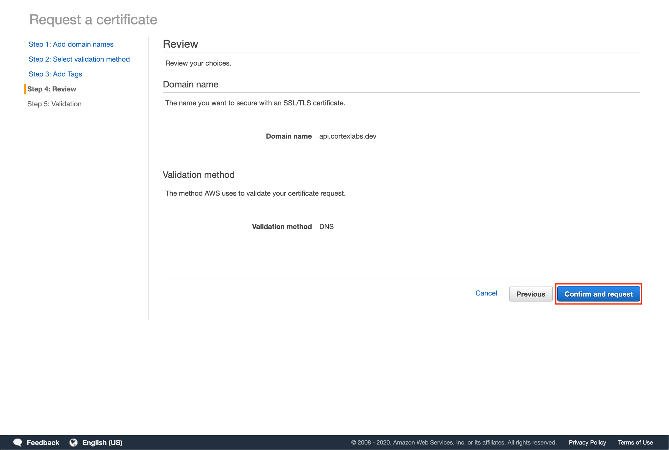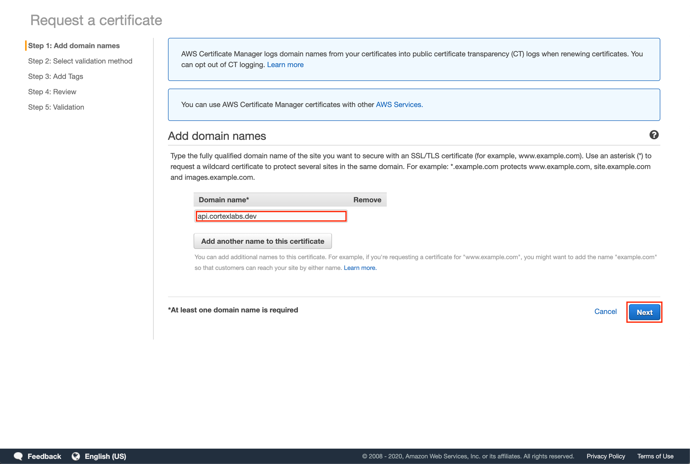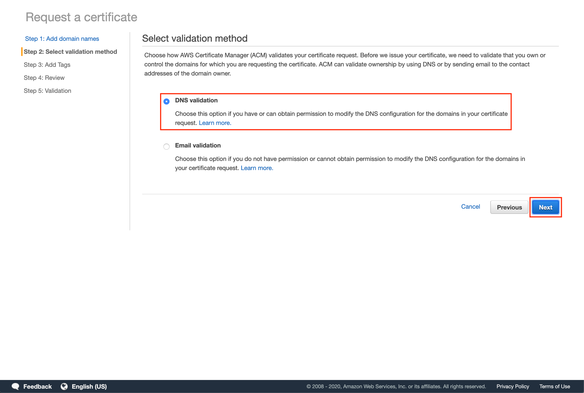 Select "DNS validation" and then click "Next".
