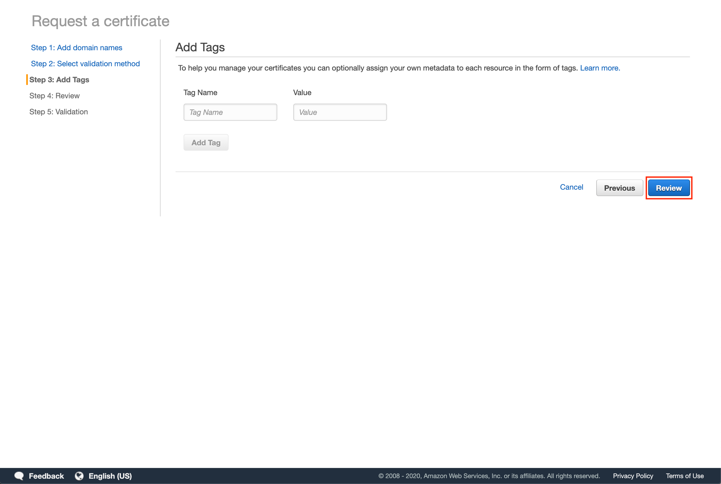 Add tags for searchability (optional) then click "Review".