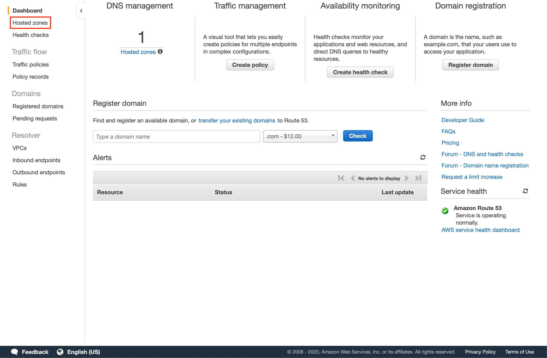 We will set up a hosted zone on Route 53 to manage the DNS records for the subdomain. Go to the Route 53 console and click "Hosted Zones".