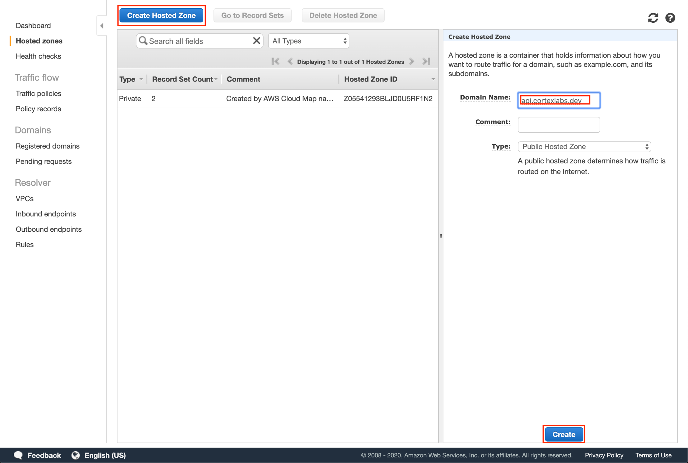 Click "Create Hosted Zone" and then enter your subdomain as the domain name for your hosted zone and click "Create".