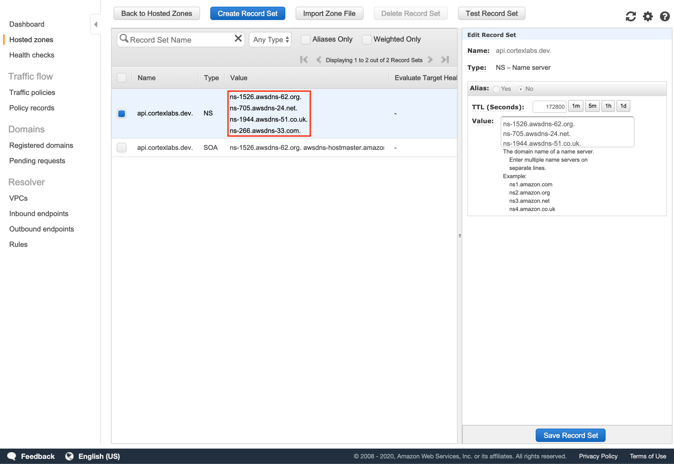 We are going to add an NS (name server) record that specifies that any traffic to your subdomain should use the name servers of your hosted zone in Route 53 for DNS resolution.
