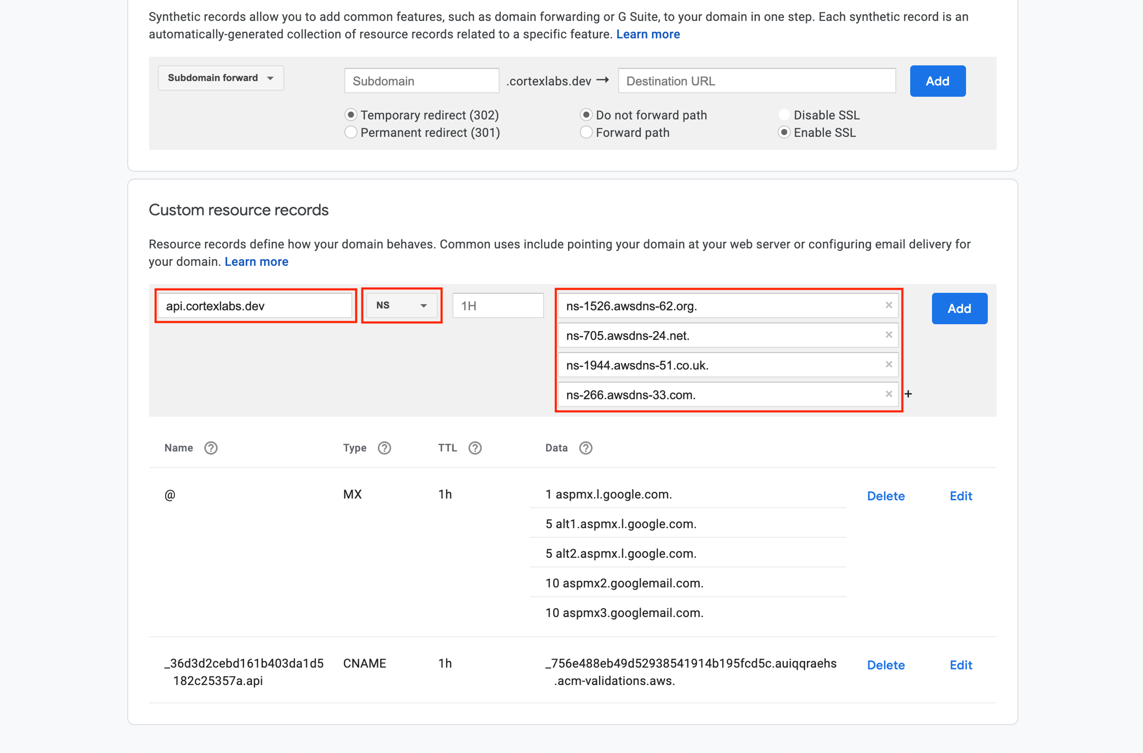 cortexlabs.dev is managed by Google Domains. The image below is a screenshot for adding a DNS record in Google Domains (your UI may differ based on your DNS service provider).