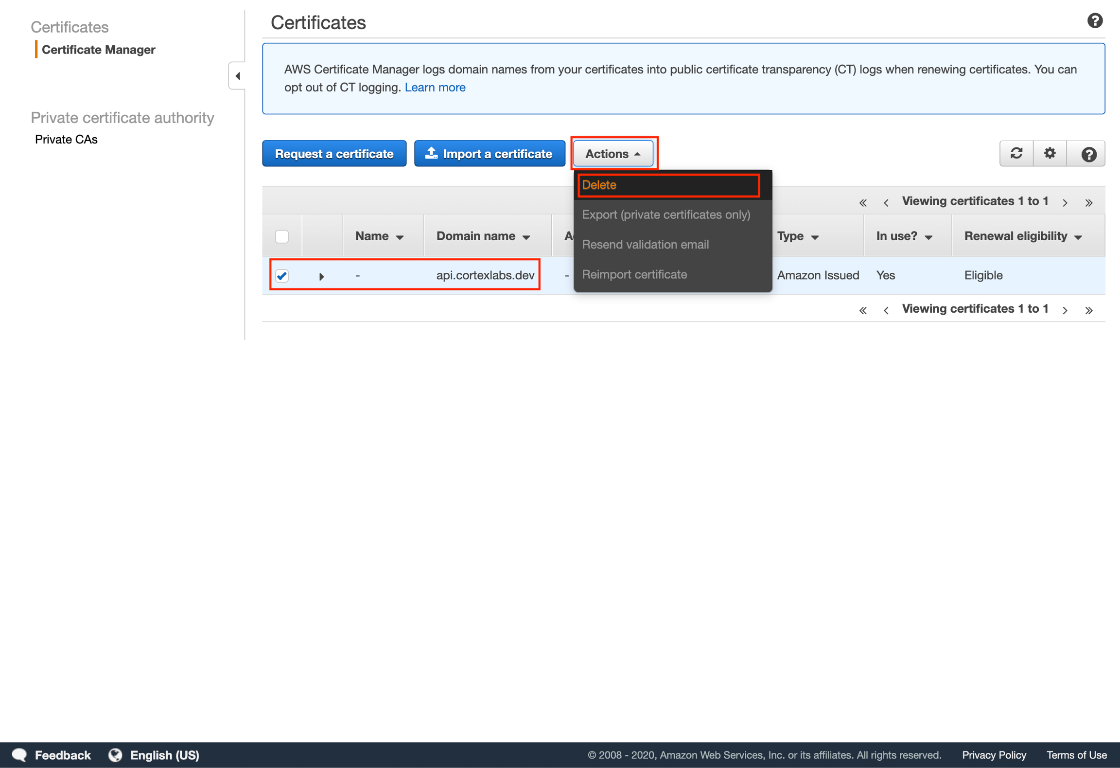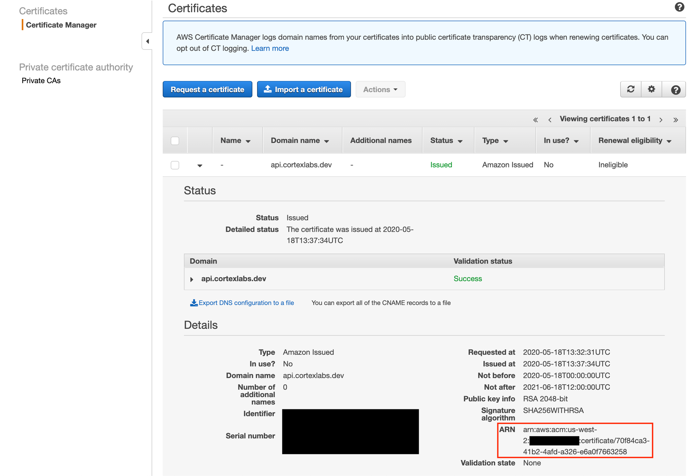 Take note of the certificate's ARN. The certificate is ineligible for renewal because it is currently not being used. It will be eligible for renewal once it's used in Cortex.