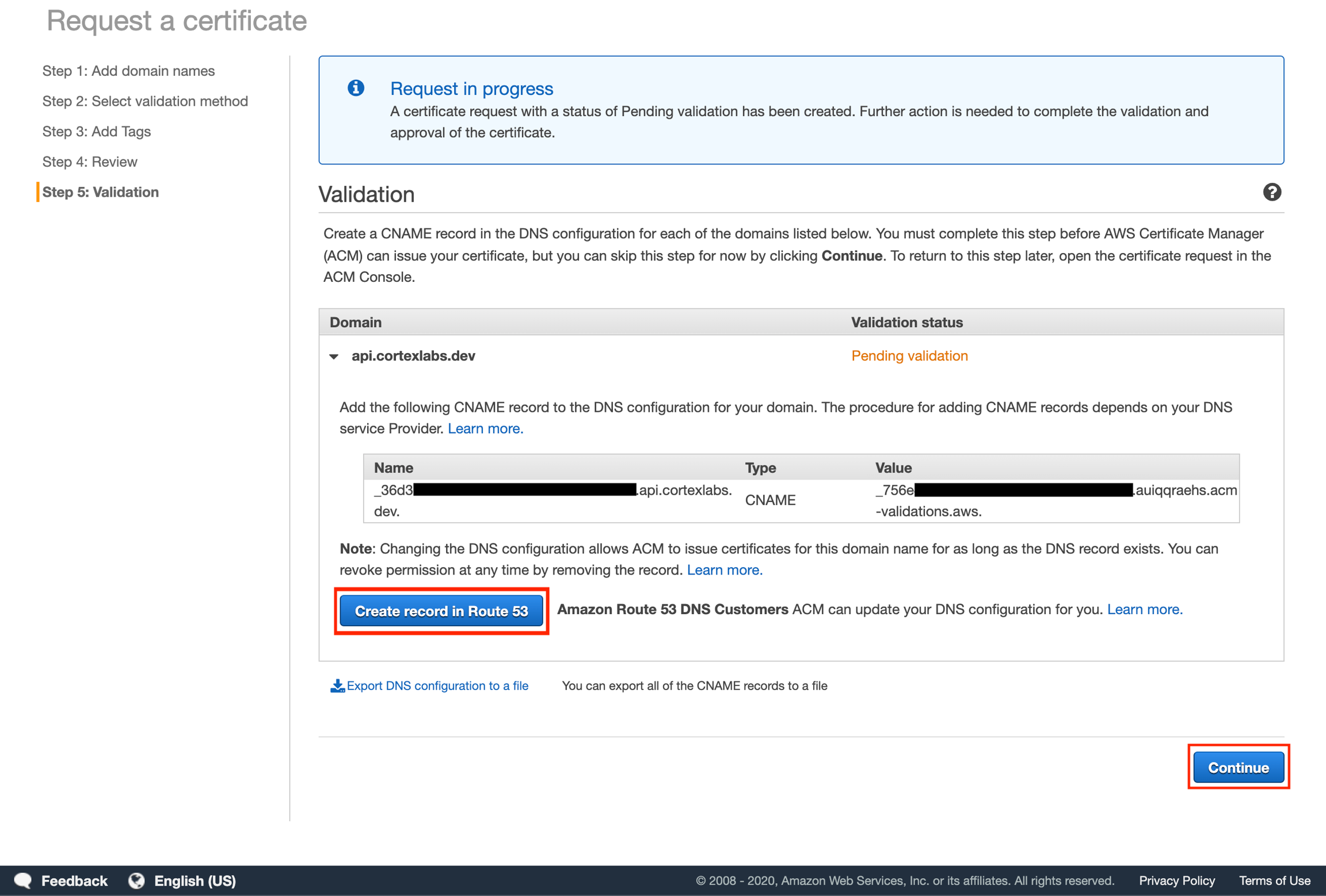 Click "Create record in Route 53". A popup will appear indicating that a Record is going to be added to Route 53. Click "Create" to automatically add the DNS record to your subdomain's hosted zone. Then click "Continue".