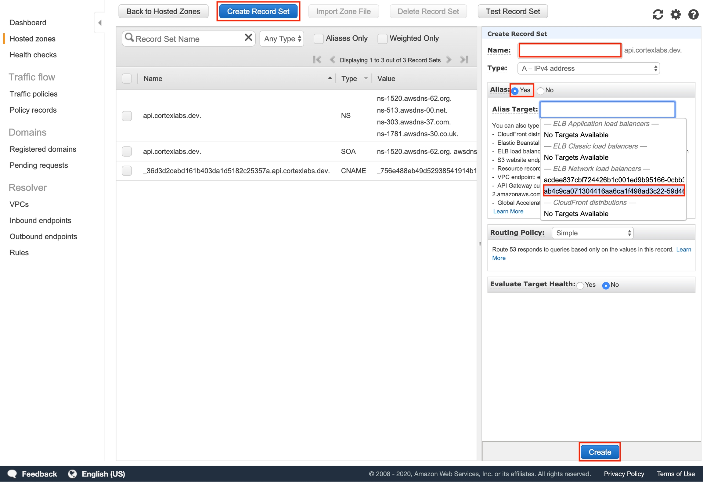Go back to the Route 53 console and select the hosted zone you created earlier. Click "Create Record Set", and add an Alias record that routes traffic to your Cortex cluster's API load balancer (leave "Name" blank).