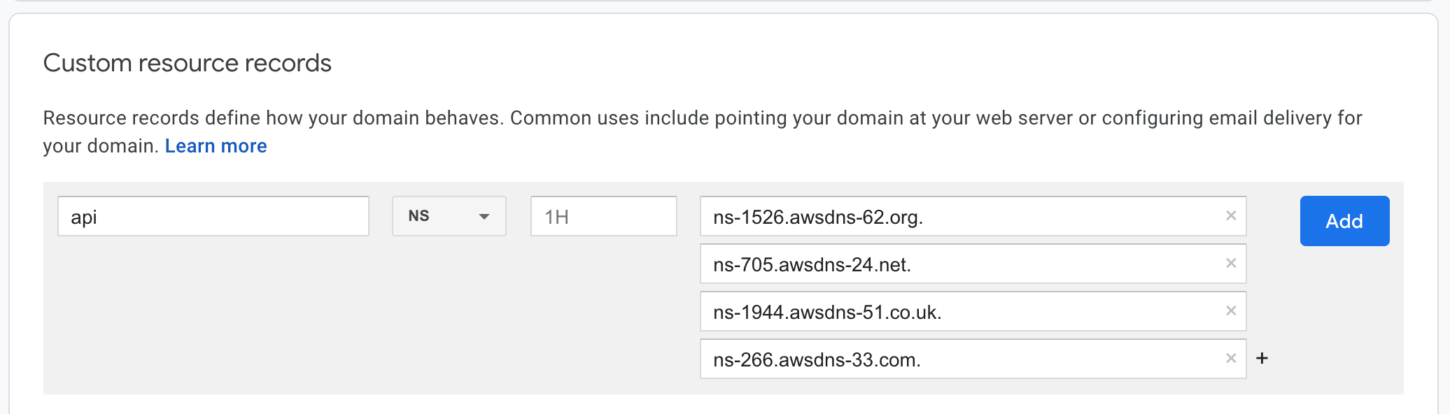cortexlabs.dev is managed by Google Domains. The image below is a screenshot for adding a DNS record in Google Domains (your UI may differ based on your DNS service provider).