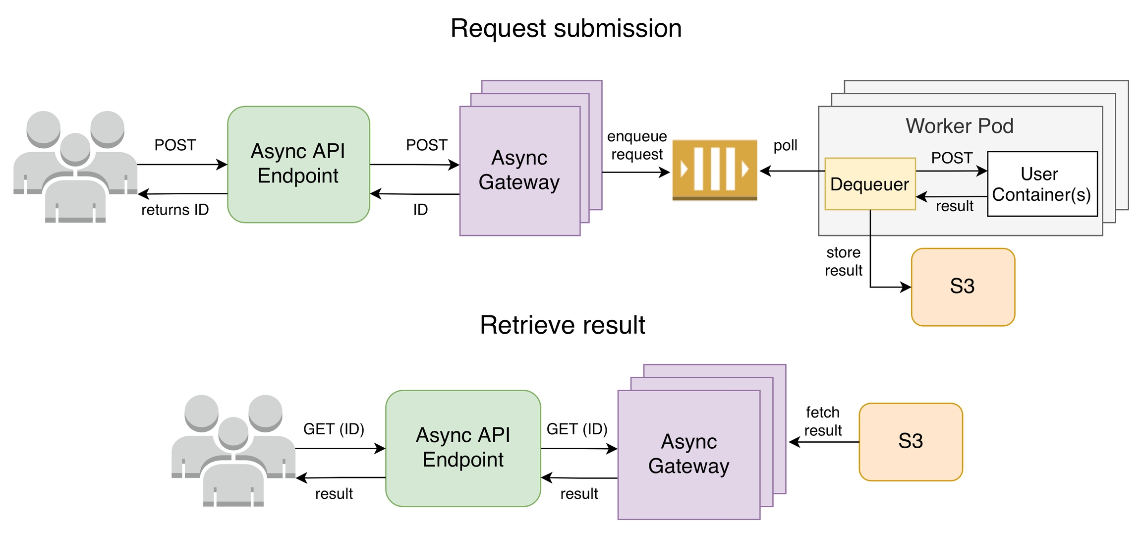 The dequeuer sidecar in the worker pod will pull the request from the SQS queue, download the request's payload from S3, and make a POST request to your containers. After the dequeuer receives a response, the corresponding request payload will be deleted from S3 and the response will be saved in S3 for 7 days.
