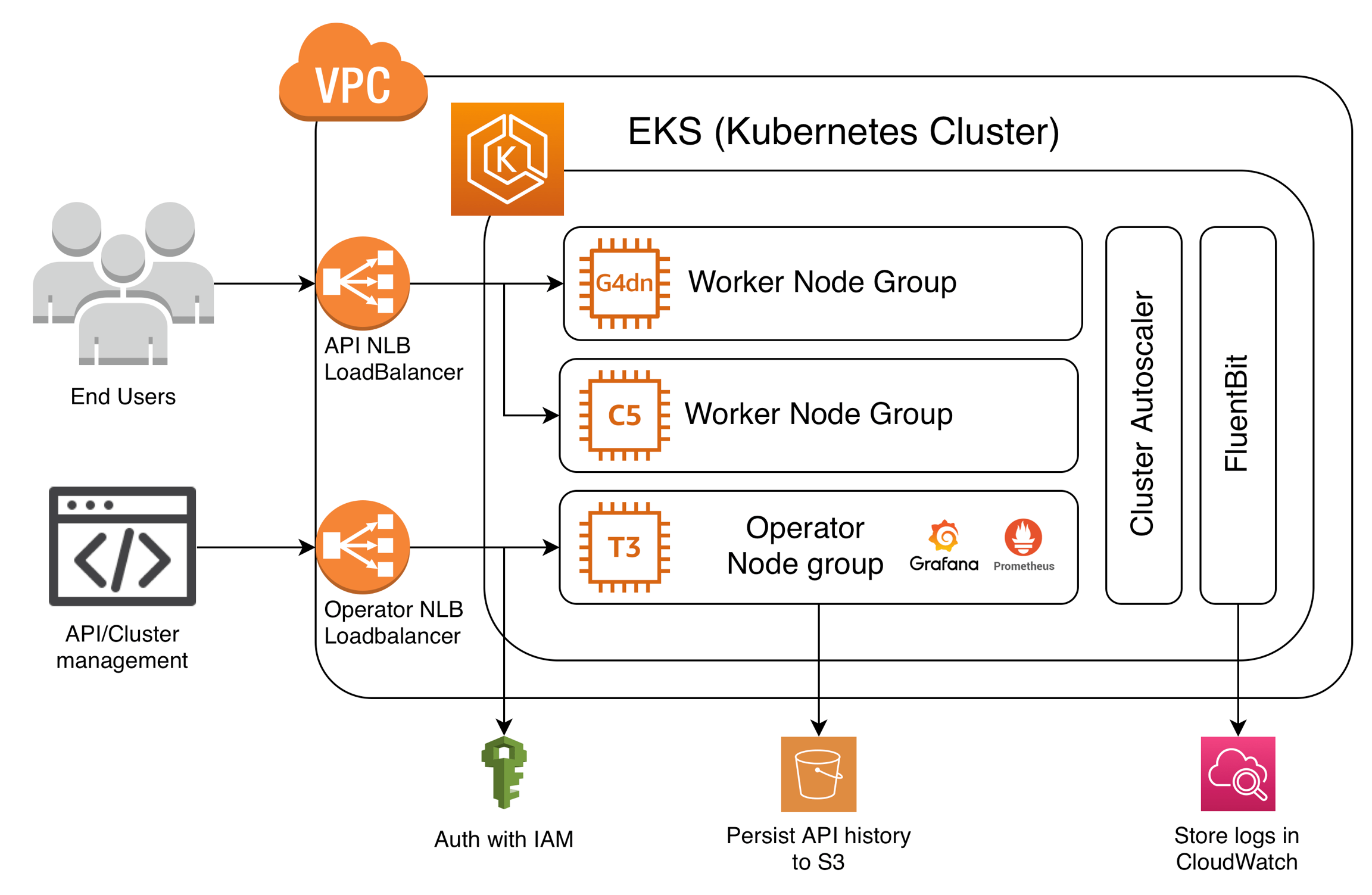 The Kubernetes cluster uses EC2 autoscaling groups for its worker node groups. Cortex supports most EC2 instance types, and the necessary device drivers are installed to expose GPU and Inferentia hardware to your workloads. Reserved and spot instances can be used to reduce costs.